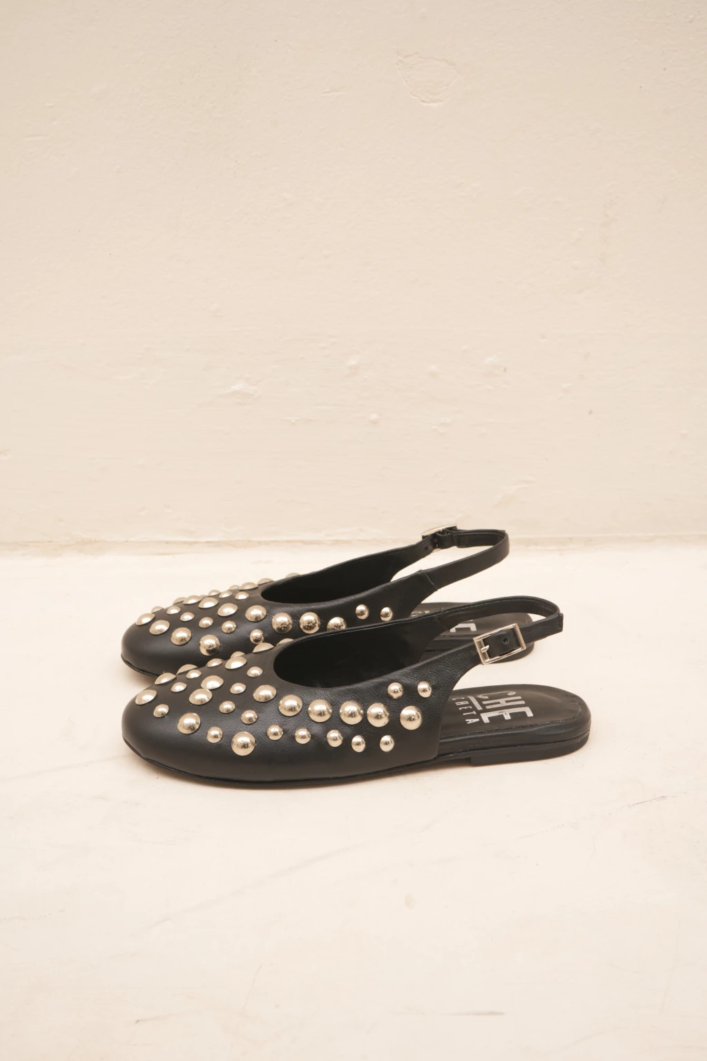 Estas ballerinas de cuero negro con tachas metálicas media bola en distintos tamaños son el equilibrio justo entre lo clásico y lo atrevido. Su diseño slingback (zapato con talon descubierto) aporta un toque femenino y fresco, mientras que las tachas le dan una personalidad fuerte y moderna. Ideales para looks de día o noche, combinan con jeans, minis o vestidos para romper la rutina con estilo. Taco de 1 cm.
